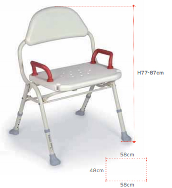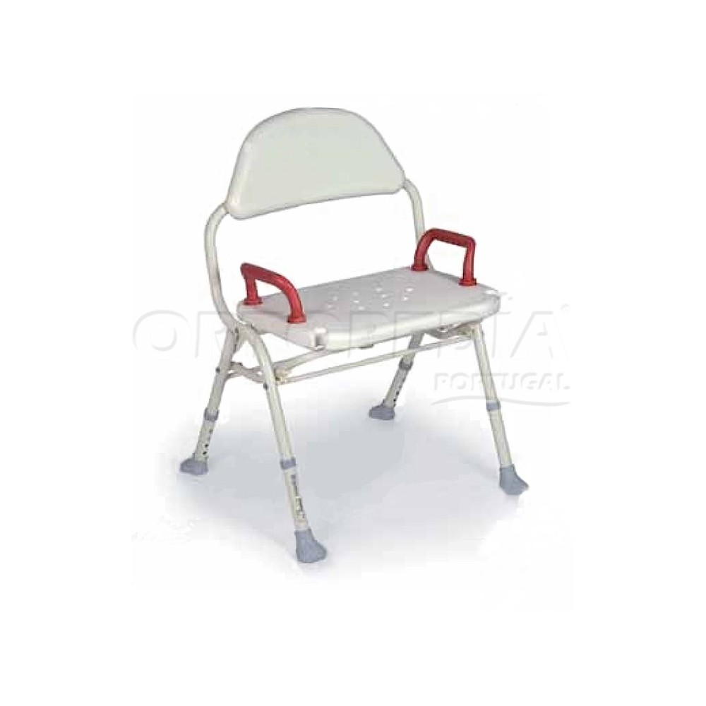 Cadeira de Banho desmontável com encosto e assento em ABS. Estrutura em alumínio anodizado.