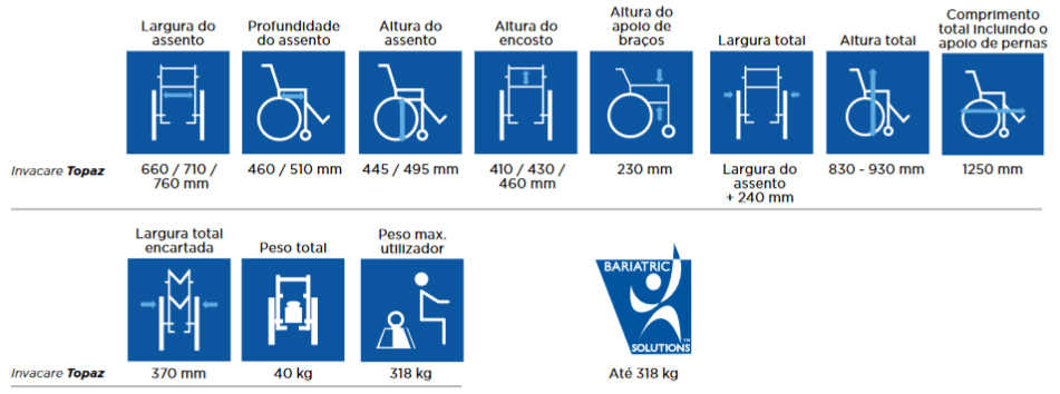 A cadeira de rodas manual Topaz foi desenhada especificamente para atender às necessidades exclusivas de utilizadores bariátricos. A Topaz reune resistência e durabilidade graças ao chassis em aço cromado composto de muito carbono, apoios de pernas e braços reforçados. Disponível em vários tamanhos de assento com telas reforçadas, com reforços também ao nível do chassis, da cruzeta e das forquetas, esta cadeira de rodas para além de ser de fácil utilização também é muito fiável.