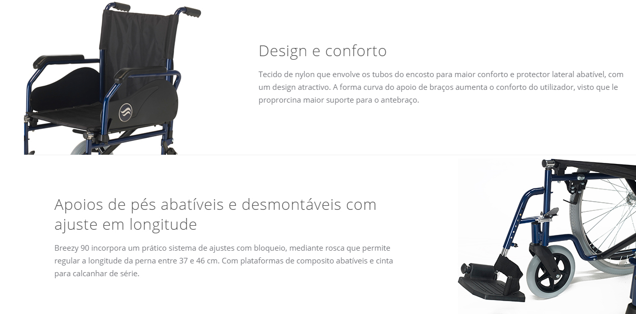 Breezy 90 é a alternativa mais económica da gama Breezy. Simples e funcional, com tudo o que é necessário para as necessidades de utilizadores esporádicos ou ocasionais de cadeiras de rodas, tanto para dentro como para fora de casa.