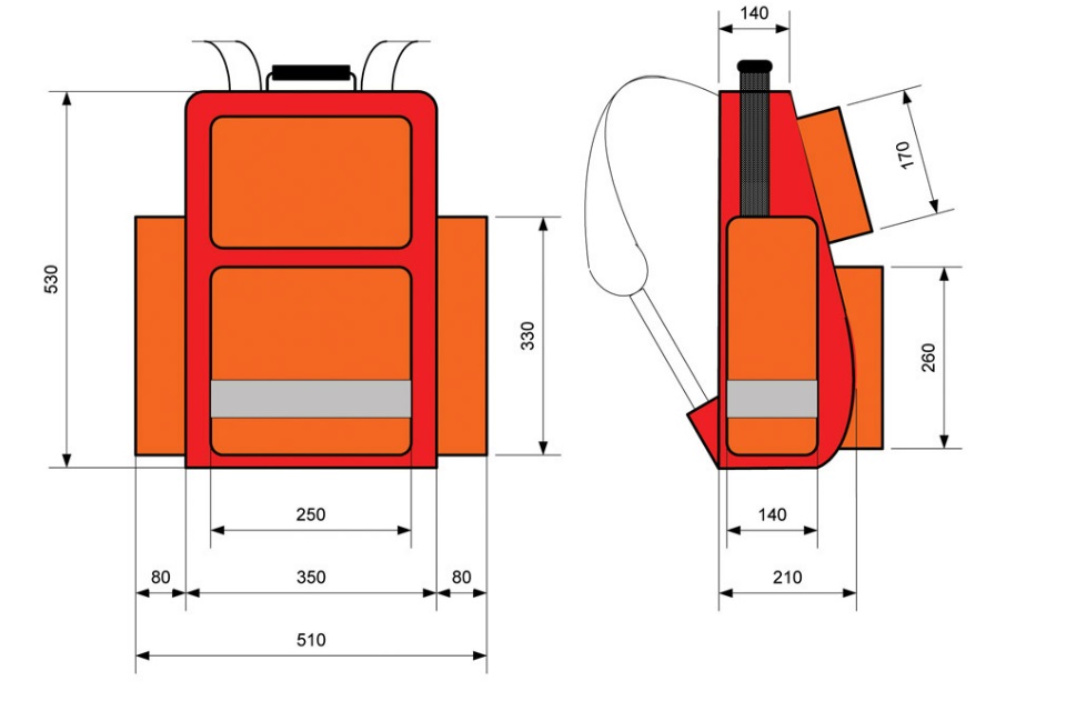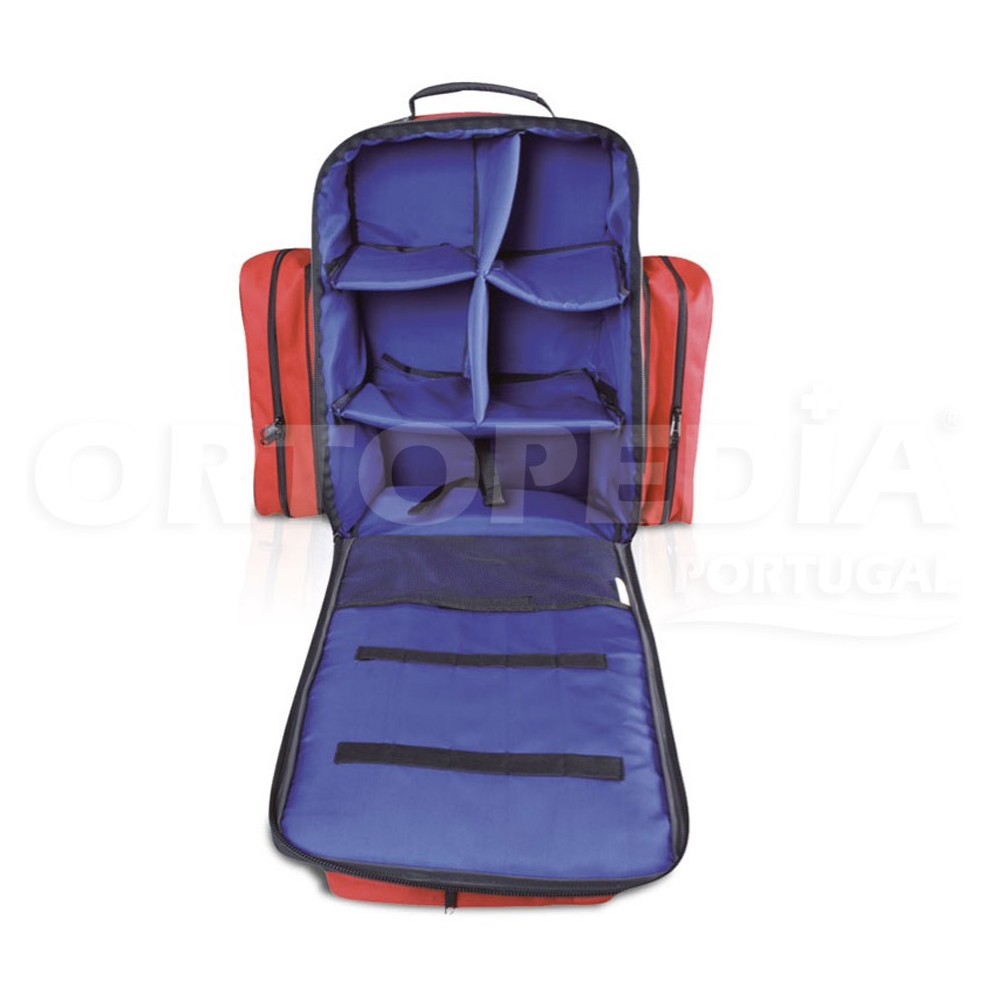 Mochila de emergência com faixas refletivas. Abertura única com fecho. Duas Bolsas laterais e várias divisórias interiores moduláveis, com pés antiderrapantes. Possui bolsa frontal no módulo superior.