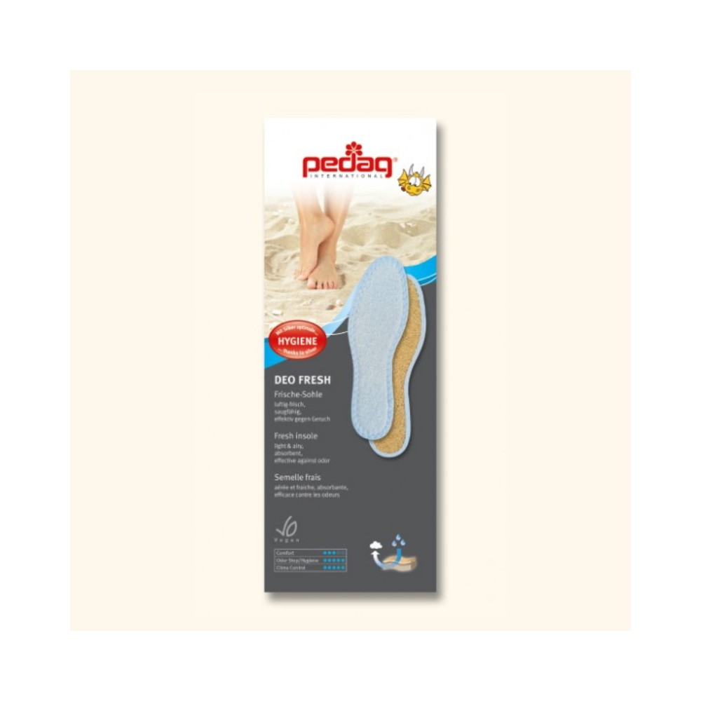 Se a criança quiser andar sem meias no verão, a palmilha pedag® Deo Fresh Kids proporciona um conforto extra e higiene no calçado infantil. Fibras de sisal leves e arejadas acomodam os pés das crianças suavemente, um pano de algodão absorvente mantém a humidade longe dos pés das crianças. A prata integrada nas fibras acaba com o mau cheiro nos sapatos de Verão, especialmente para as sapatilhas "ténis" de verão e garante ainda mais higiene.